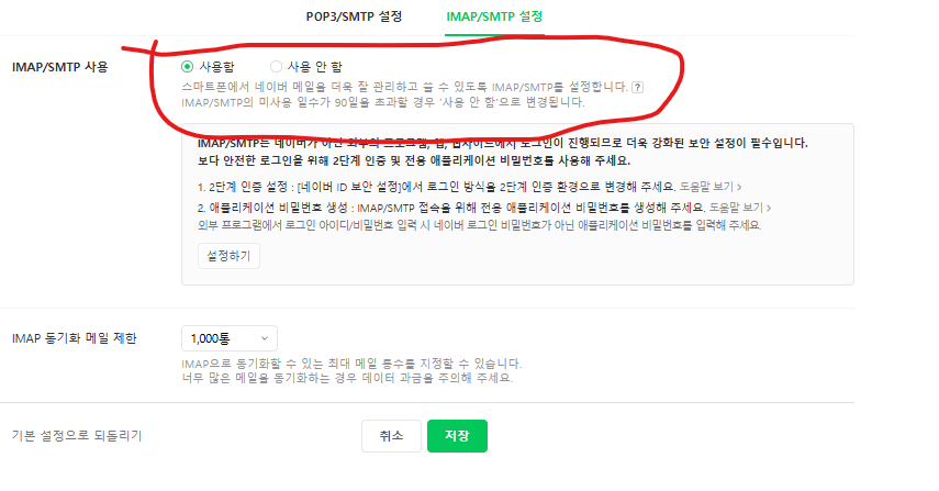 3. 네이버 메일 => 환경설정 => POP3/SMTP 설정과 IMAP/SMTP 설정이 "사용 안 함" 으로 세팅되어있어서 생긴 에러